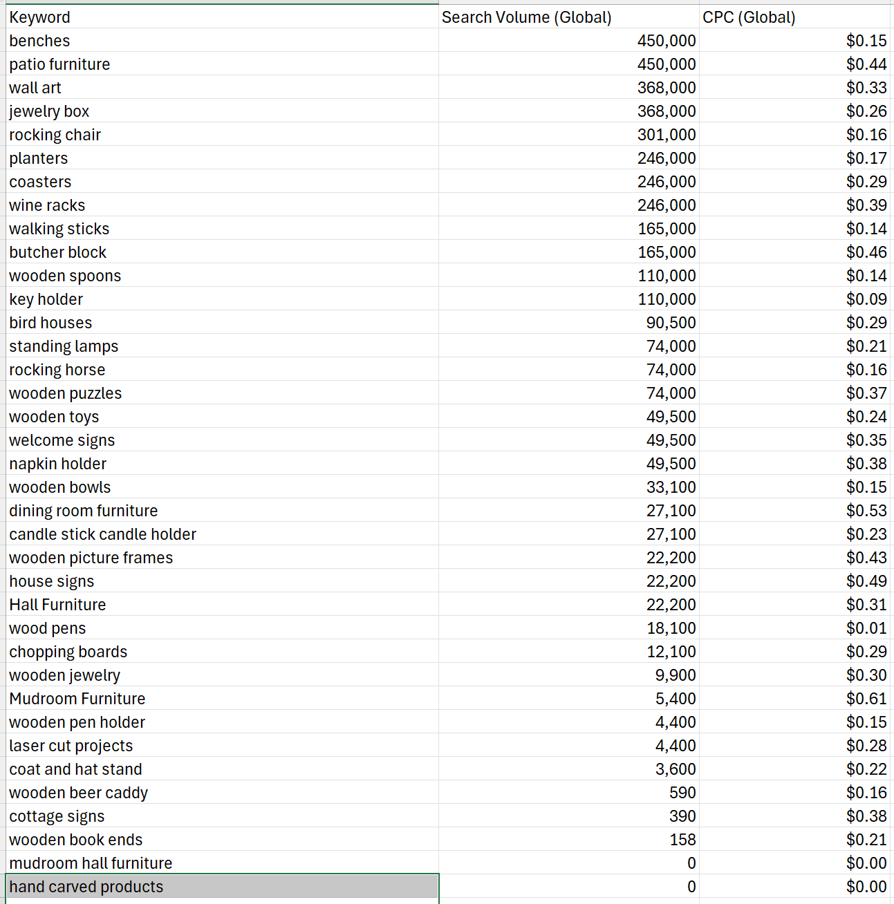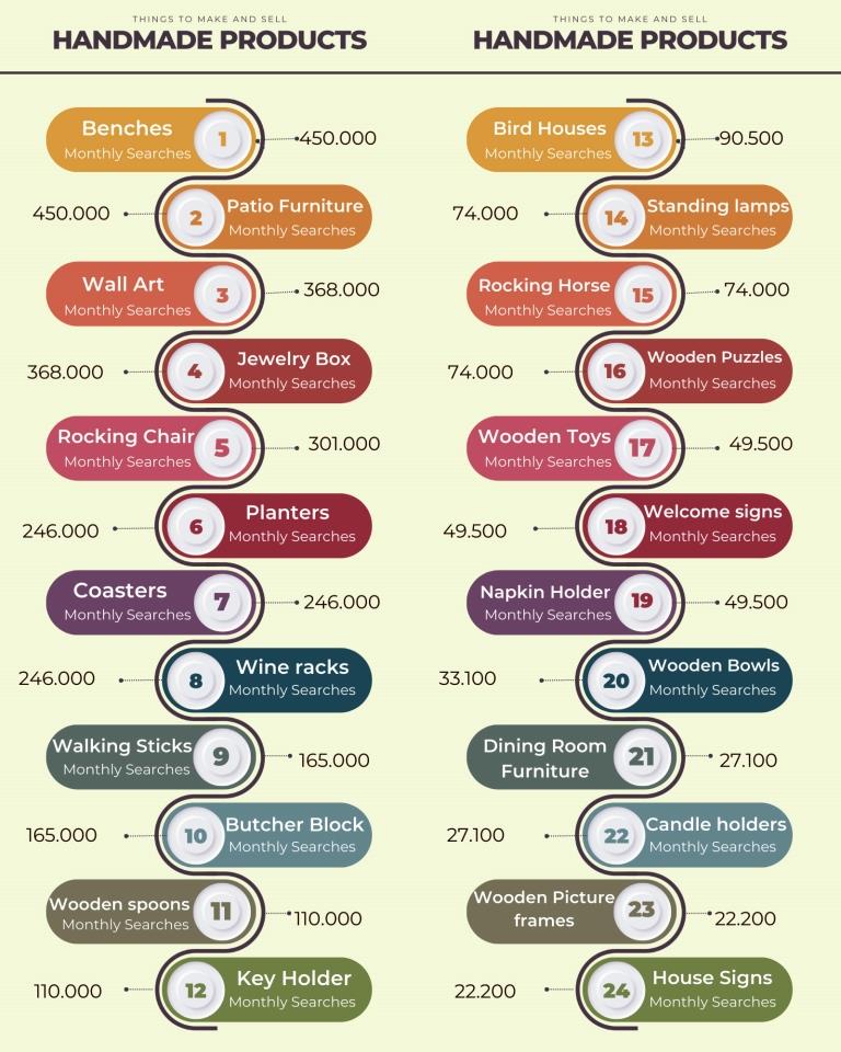 Here’s a look at the search volume data for various handmade items, organized by popularity, to help you understand what people are most interested in and where there may be untapped potential.
